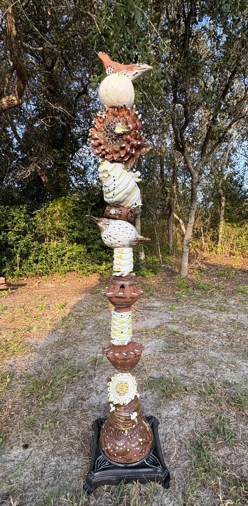 Ann Tilley Smith is a native Texan, Master Gardener, and ceramic artist who has been happily “playing in the clay” for more than 45 years. She hand-builds colorful, whimsical, and nature-inspired sculptures for both indoor and outdoor spaces. Her goal is simple: add color and personality to the dull spots—whether they’re in a garden, on a patio, or wherever a splash of character is needed. She often sneaks in found organic materials and, with help from her husband, many of her pieces end up perched on welded metal structures he builds.